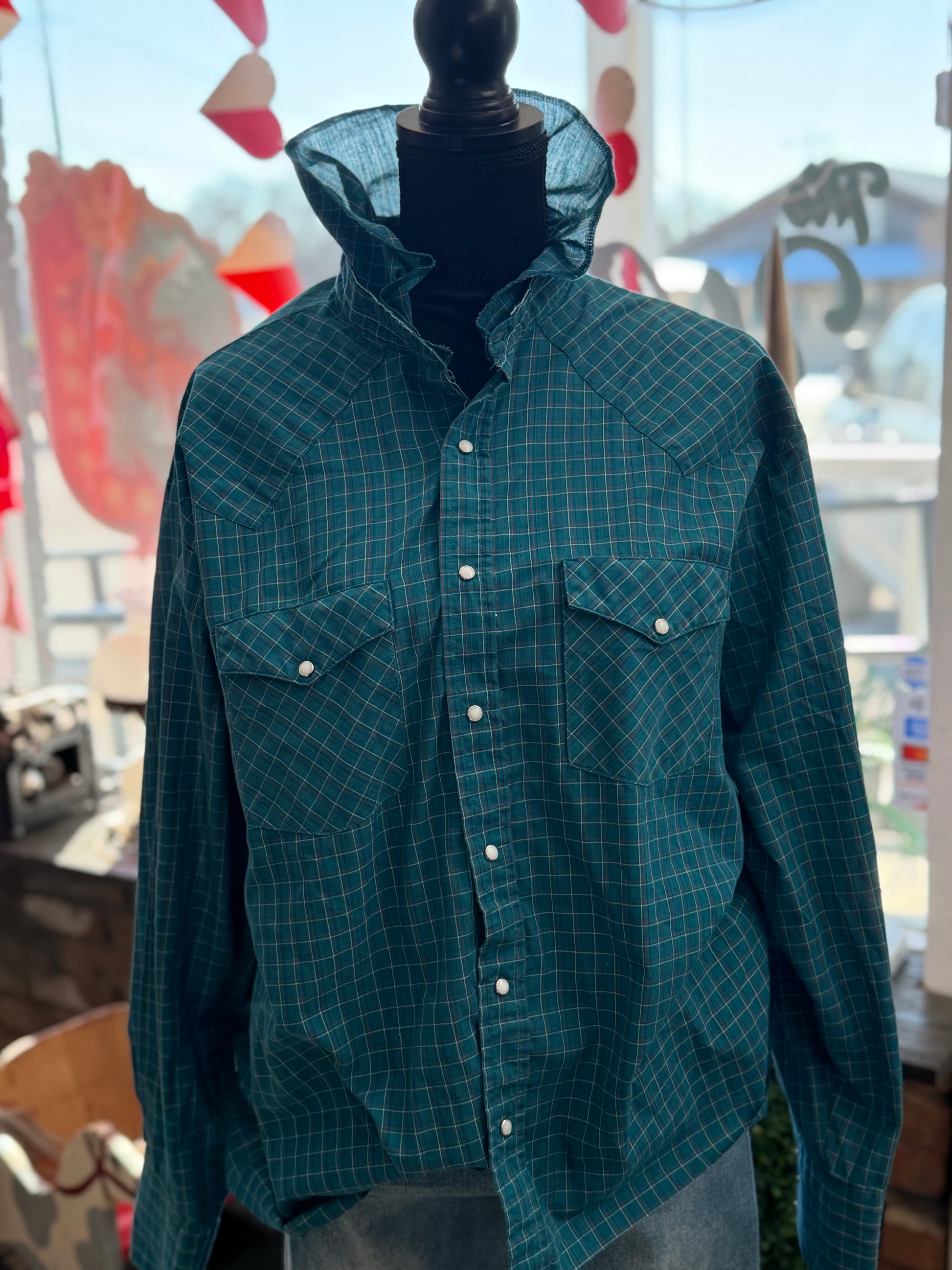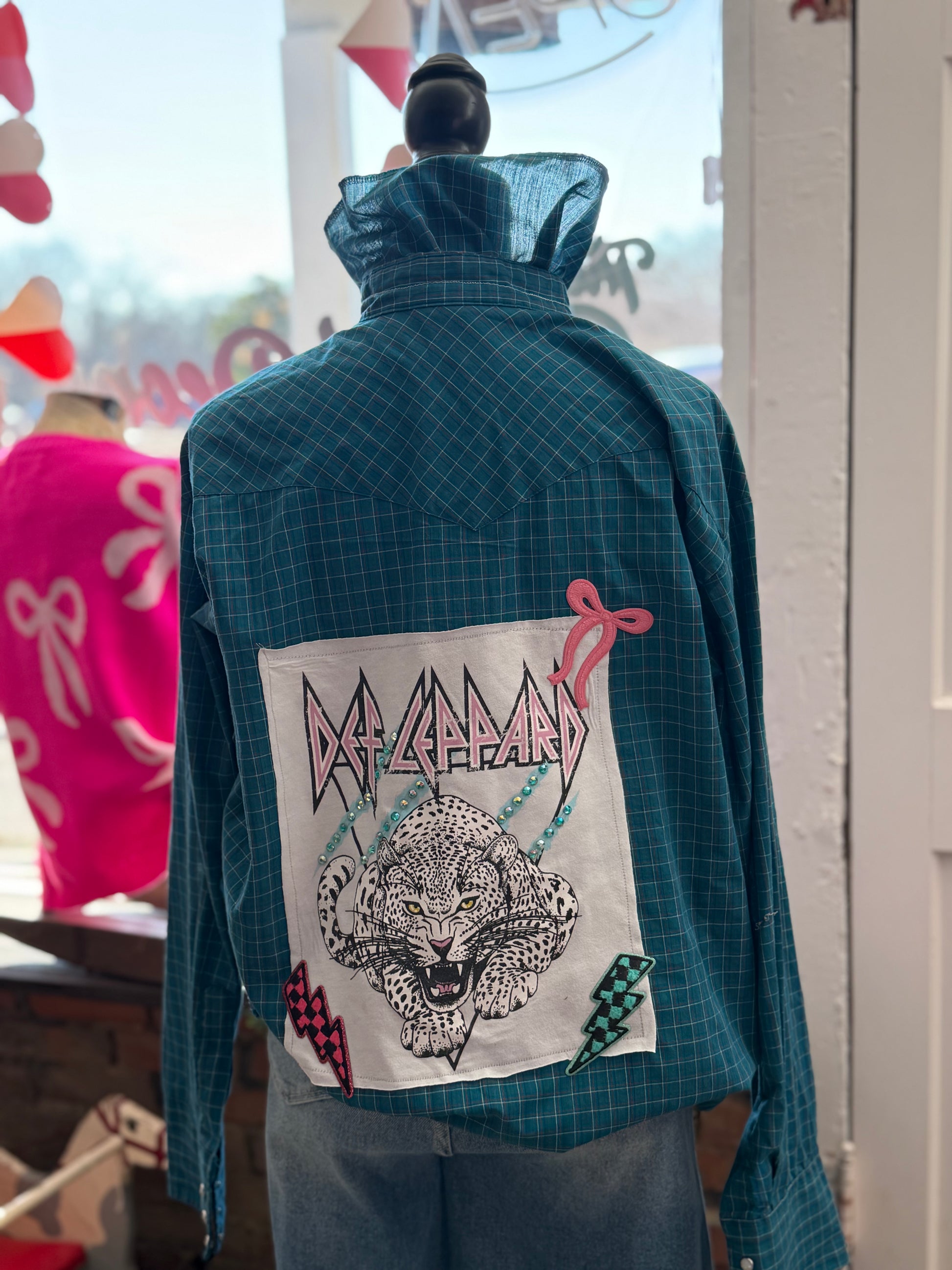 HOLT Vintage pearl snap with crinkle collar and raw edge. Def Leppard deal with simple jeweled detail.