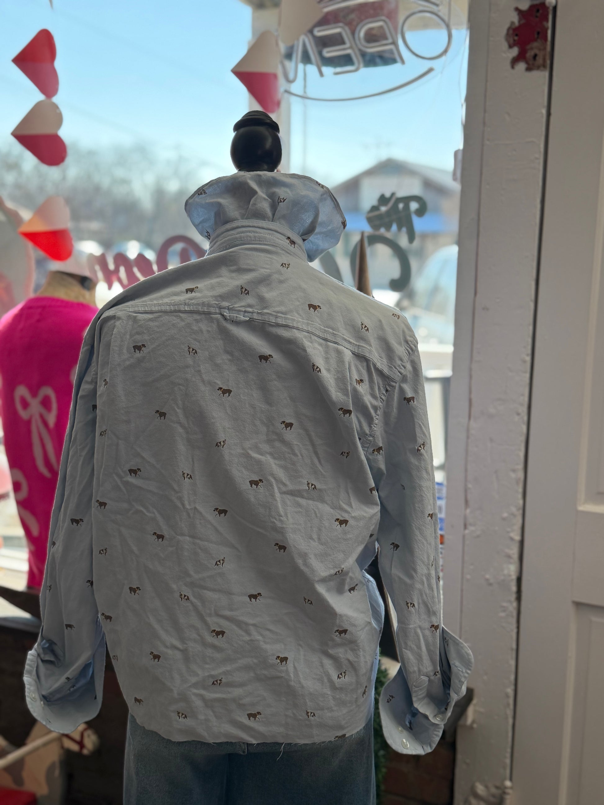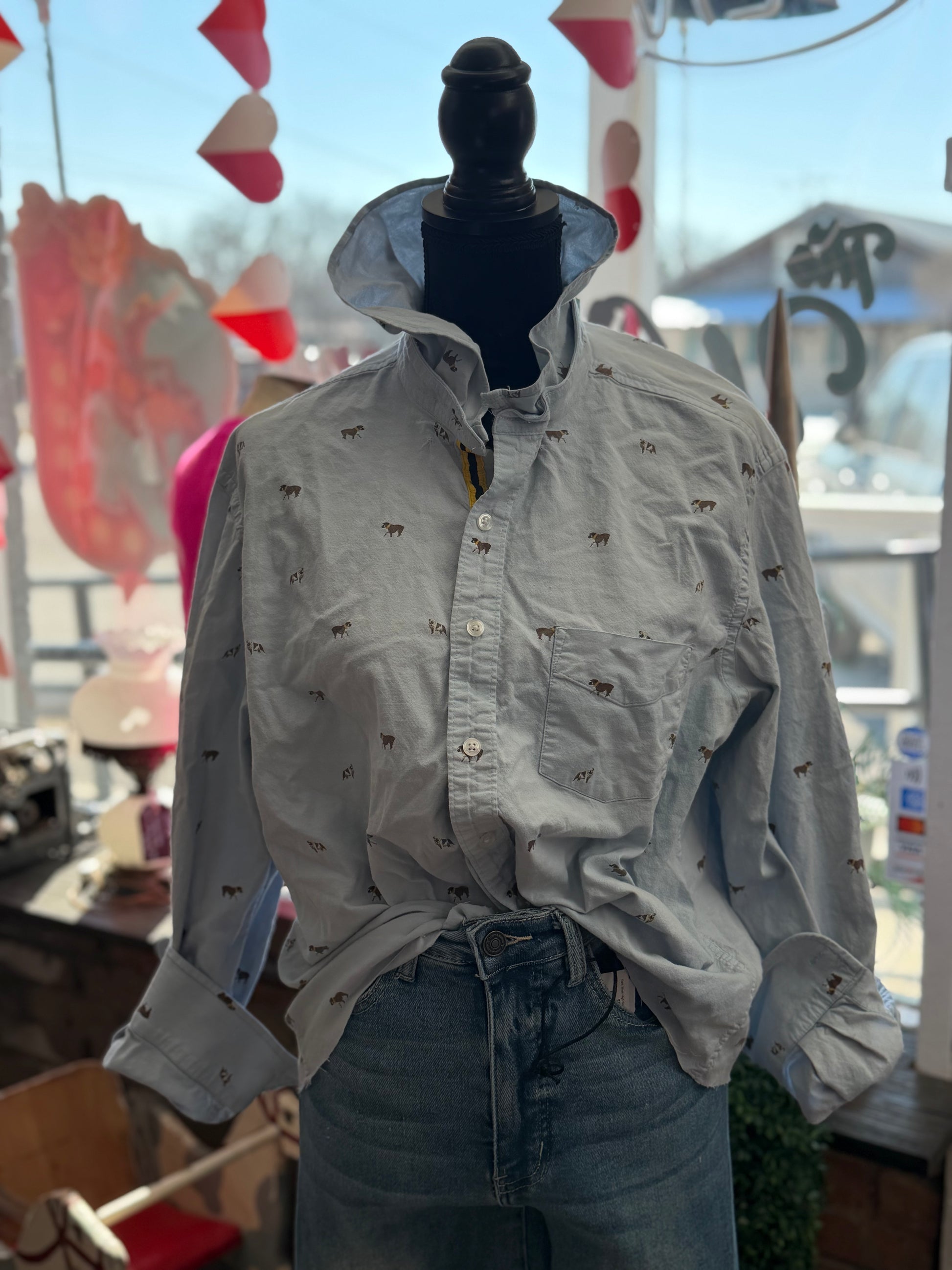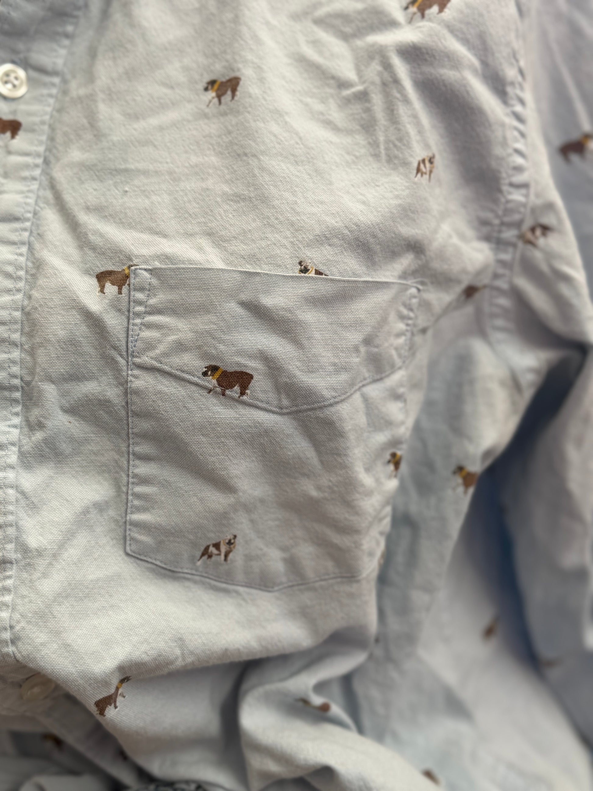 Club Room button up, soft precious blue with bulldog and crinkle collar. Raw edge
