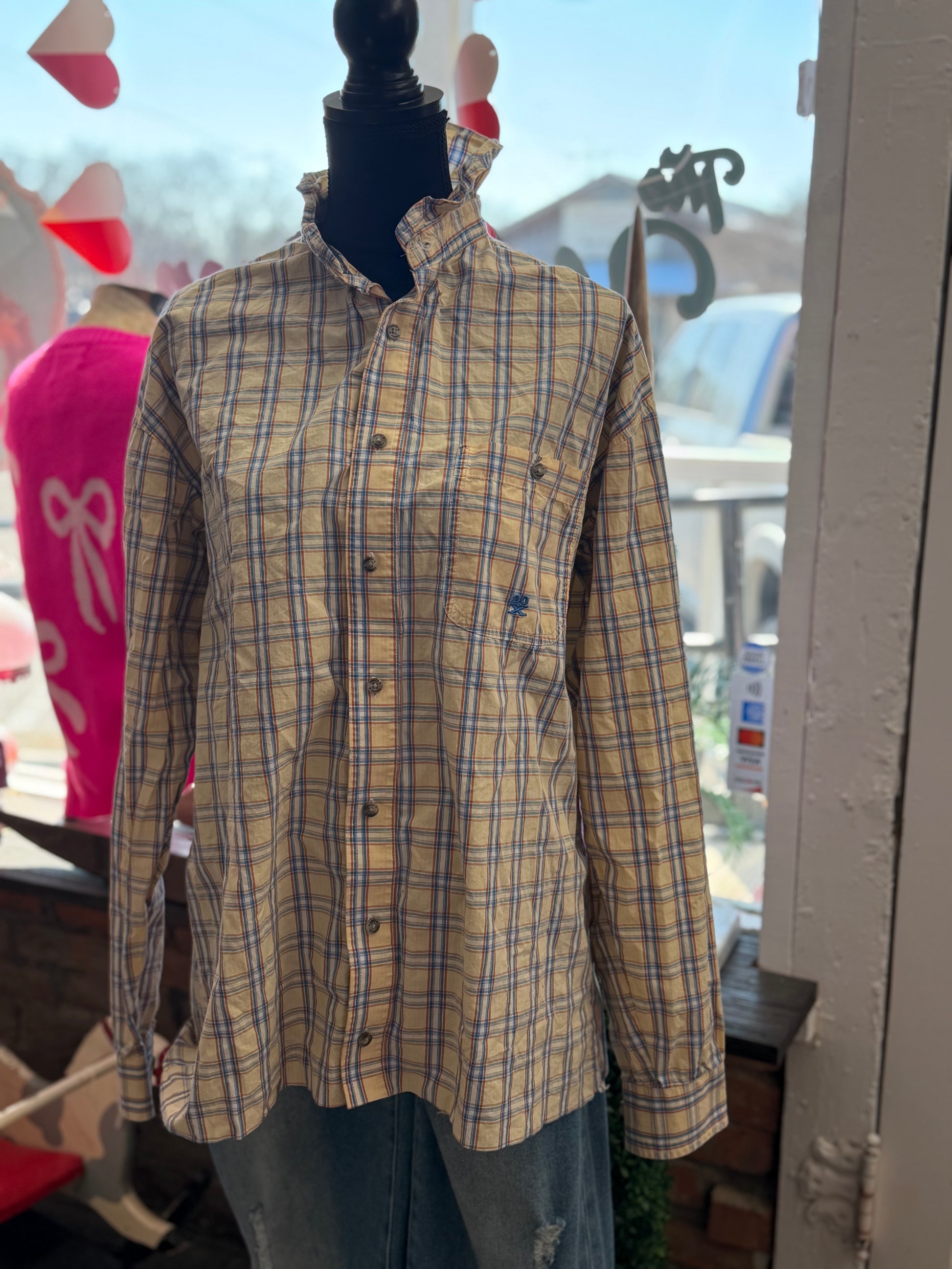 20X button up with crinkle collar. Large TALL w/ raw edge