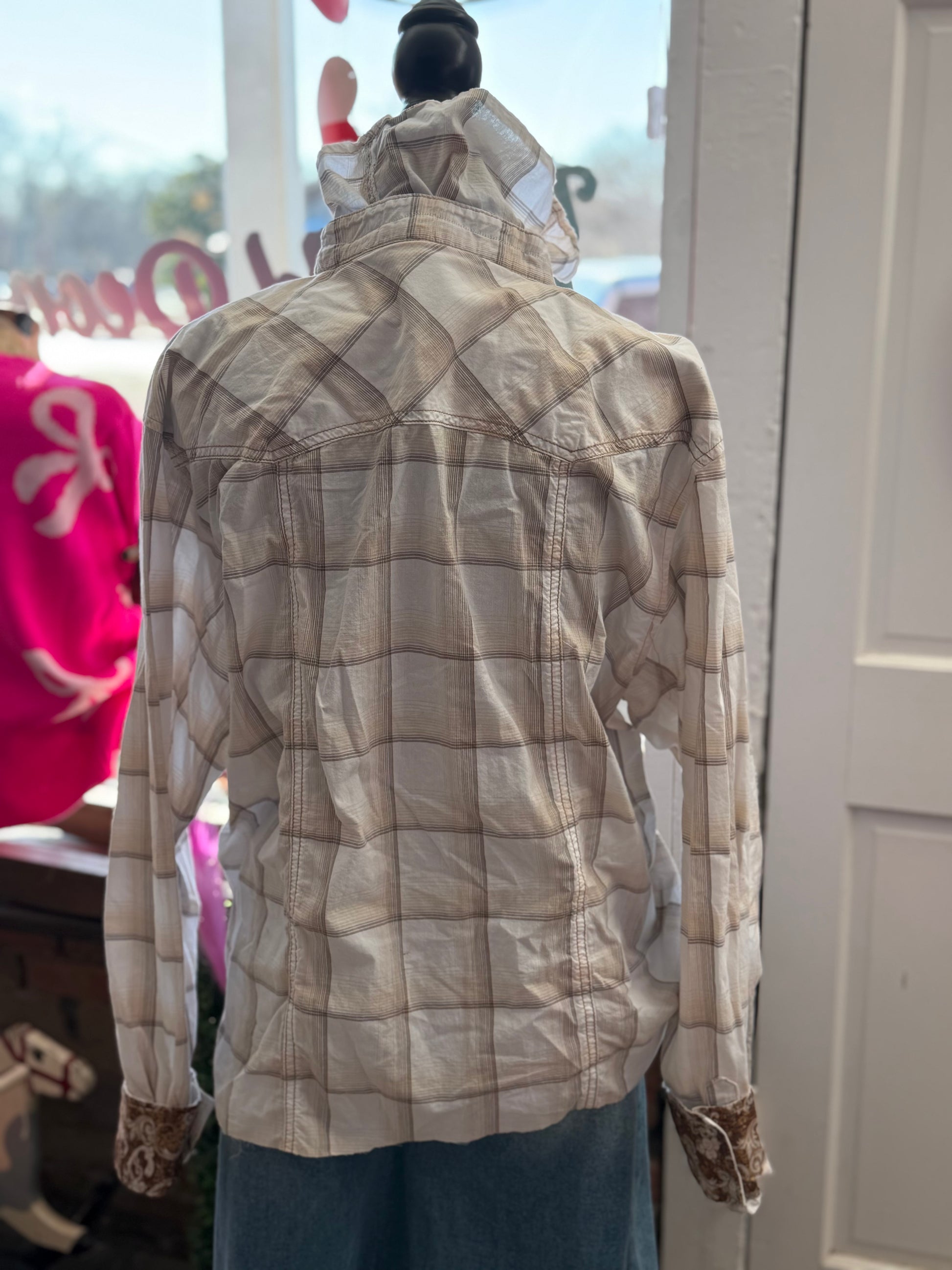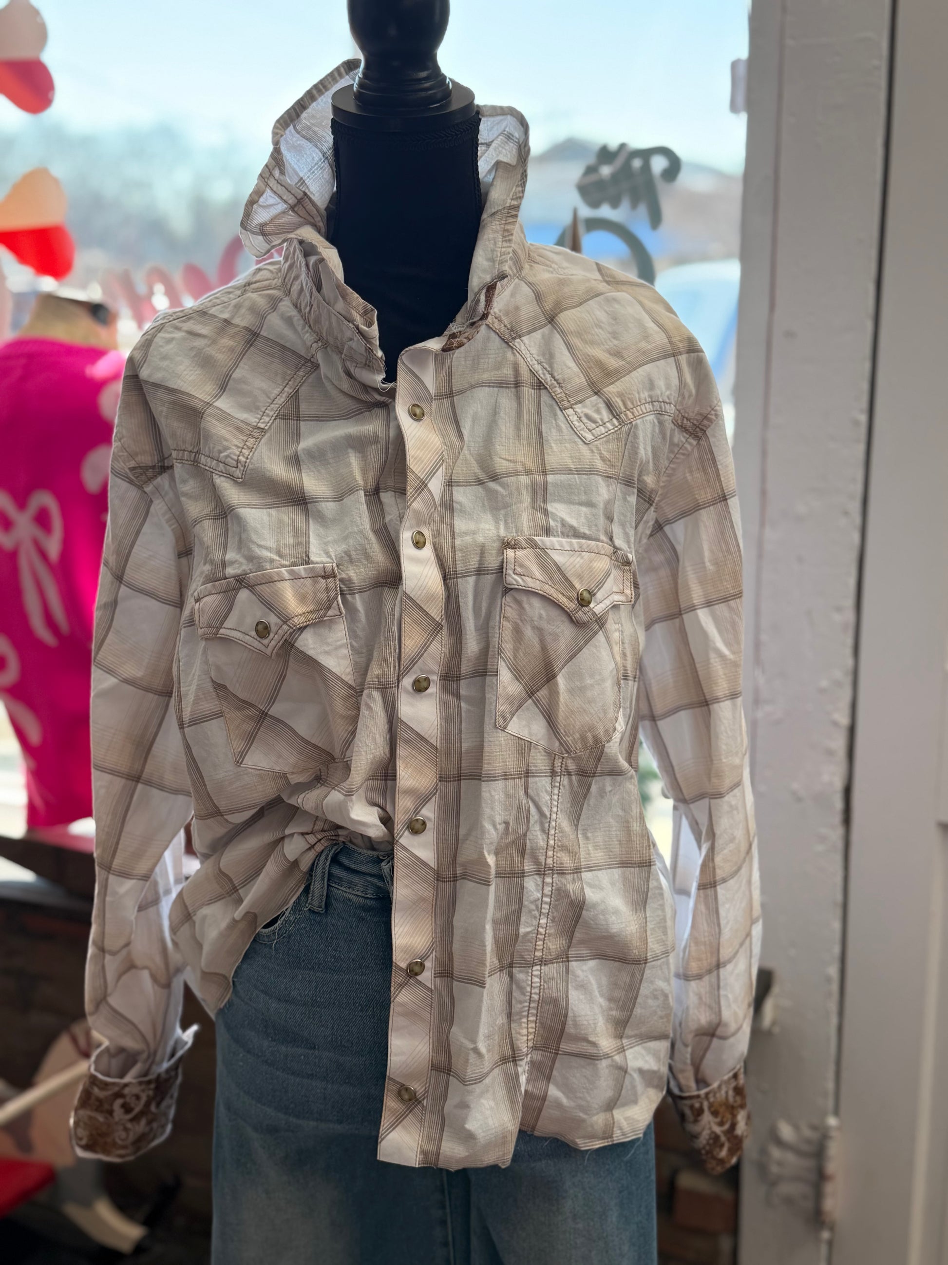 Wrangler Retro pearl snap with crinkle collar and raw edge.