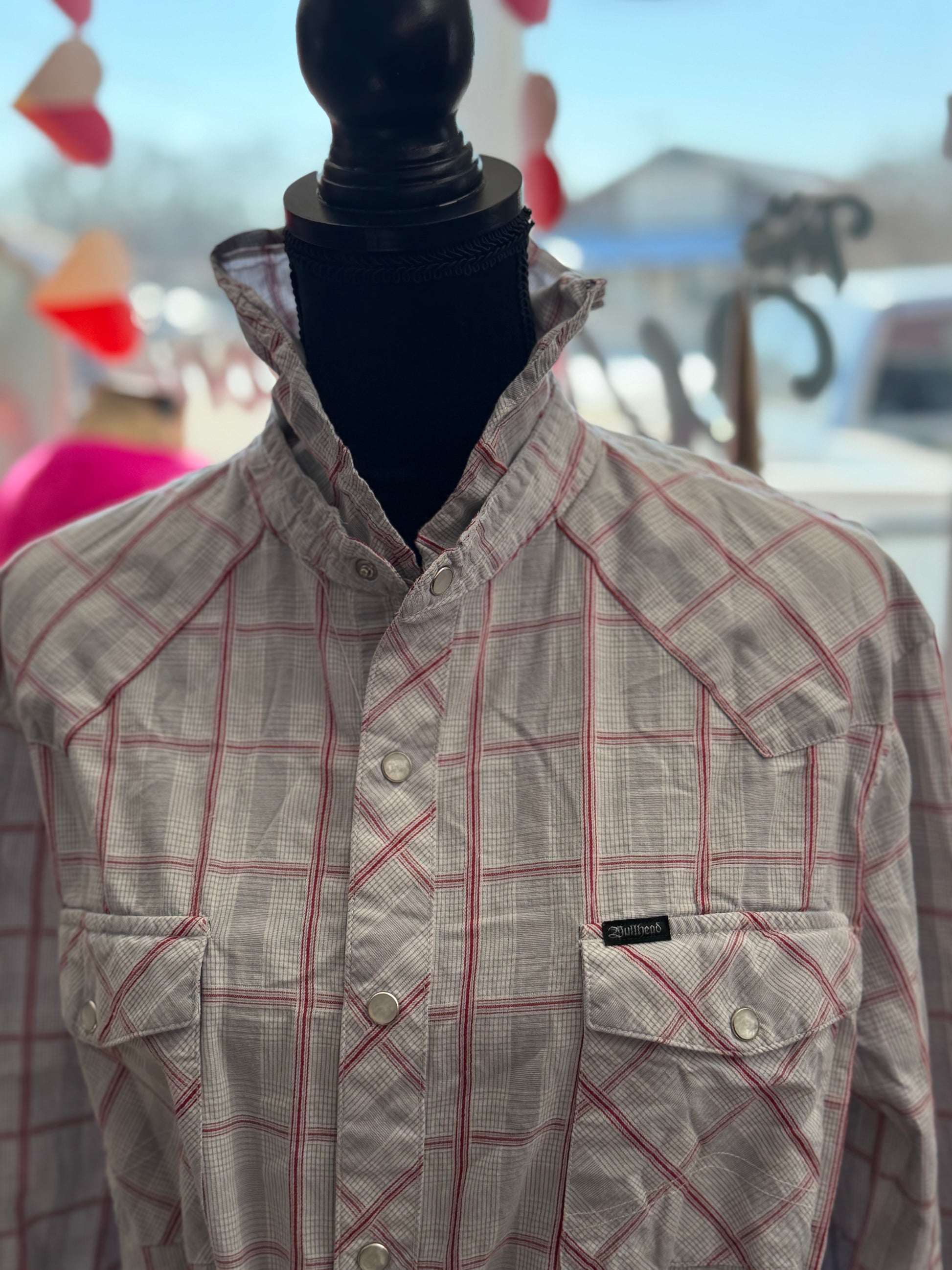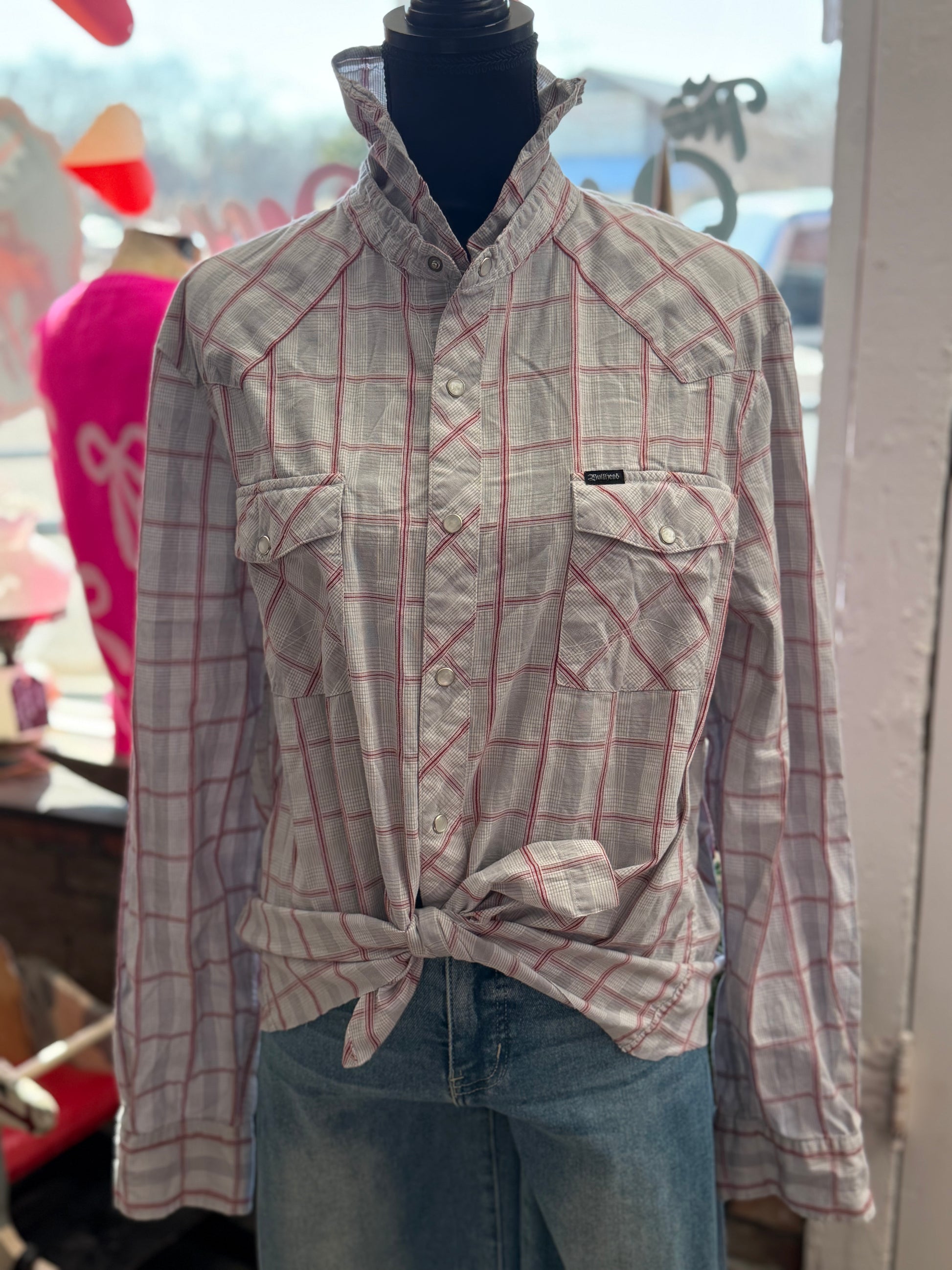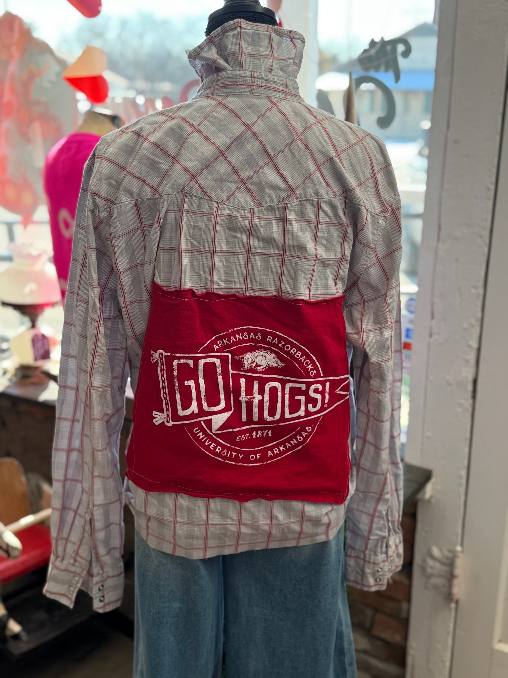 Bullhead vintage pearl snap Xl, Razorback added with crinkle collar and raw edge.