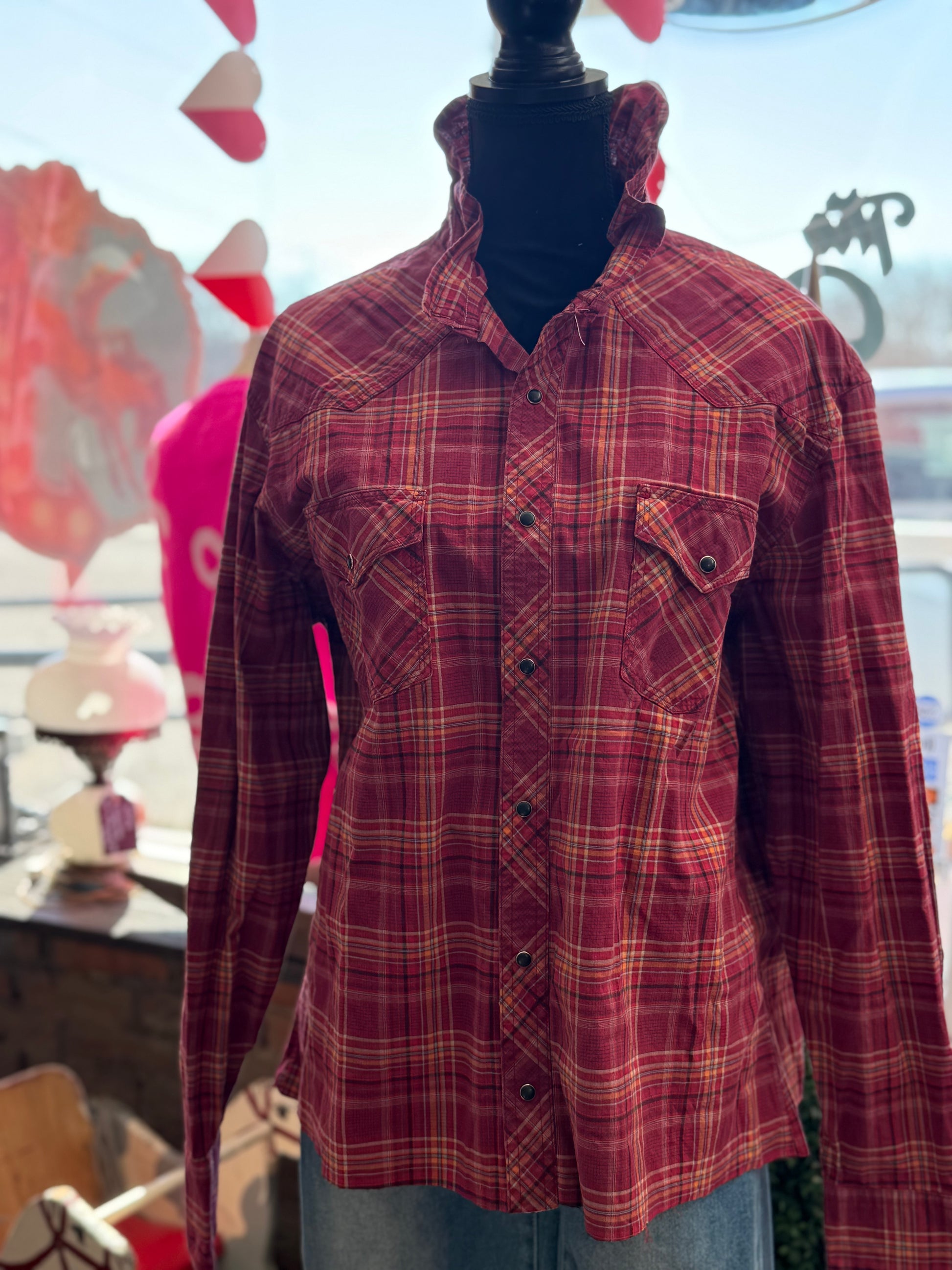 20X Wrangler Pearl Snap, Men’s XL. Crinkle collar w/raw edge.